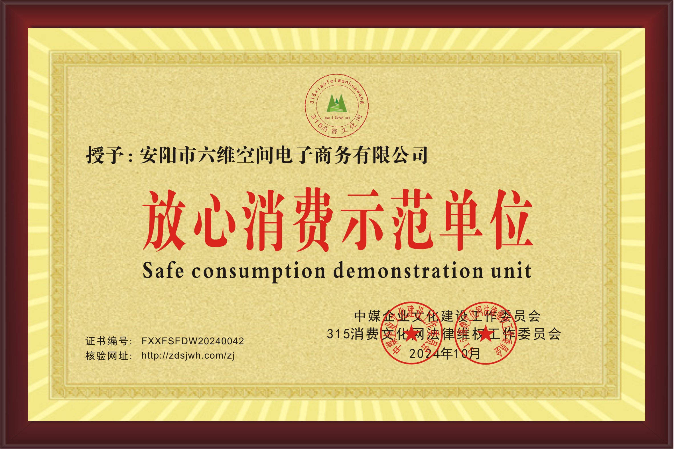 热烈祝贺安阳市六维空间电子商务有限公司被授予“放心消费示范单位”。