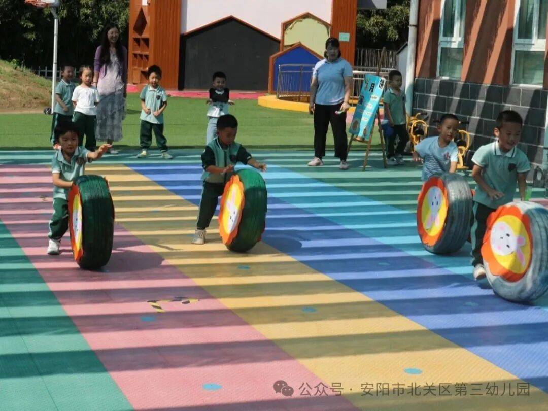 小朋友们化身“中秋小司机”,推动着贴满圆形月饼图案的轮胎奋力向前。轮胎咕噜噜地滚动,如同一只只巨大的月饼在地上飞速旋转。