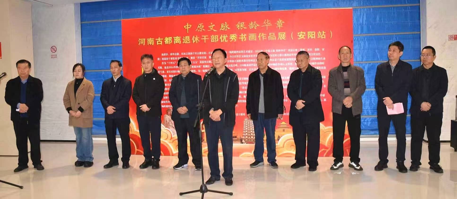 安阳市委老干部局副局长刘览在开展仪式上致辞 :初冬暖阳照洹水,笔墨丹青绘华章。今天,我们怀着喜悦的心情,在千年古都安阳迎来“中原文脉 银龄华章”河南古都离退休干部优秀书画作品展的第三站展览。首先,我谨代表中共安阳市委老干部局,向莅临本次开展仪式的各位领导、各位老同志和嘉宾朋友们,表示热烈的欢迎!向统筹推进本次联展的开封市委老干部局及四市承办单位,致以衷心的感谢!向为本次展览倾注心血的老艺术家们,致以崇高的敬意!四市联展旨在以艺术为桥,凝聚银龄力量、传承中原文脉。9月15日,主办城市开封市启幕首展,郑州站接续传递文化薪火,今日,这抹银龄艺术的亮色终于抵达安阳。作为中原文脉不可或缺的重要坐标,安阳既有殷墟甲骨、曹魏高陵的历史文脉根基,更有红旗渠精神等新时代活力。本次参展的230幅作品,正是对这份“文脉传承、时代奋进”的最佳诠释:开封作品尽显宋都风韵,郑州作品饱含省会担当,洛阳作品深蕴神都气象,安阳的50幅佳作则以“甲骨文元素”“红旗渠精神”“洹新貌”为魂,将老干部们对家乡的热爱、对时代的赞颂融入宣纸之上。各位老同志是安阳发展的见证者、参与者、贡献者,退休之后以书画为载体,继续践行“退休不褪色、离岗不离党”的初心。这些作品,不仅是笔墨技巧的展现,更是“听党话、跟党走”理想信念的生动写照,是“老有所乐、老有所为”精神风貌的鲜活缩影,为全市广大党员干部和群众树立了榜样。在此,我衷心希望各位领导、嘉宾和朋友们,能在本次展览中感受中原文脉的深厚底蕴,体会银龄艺术家的赤子情怀;也希望全市广大离退休干部能以本次展览为契机,继续以艺术为媒,传递正能量、唱响主旋律;更希望四市老干部系统能以本次联展为纽带,深化交流、携手共进,让“中原文脉 银龄华章”的品牌越办越好,为河南文化强省建设贡献更多银龄力量!