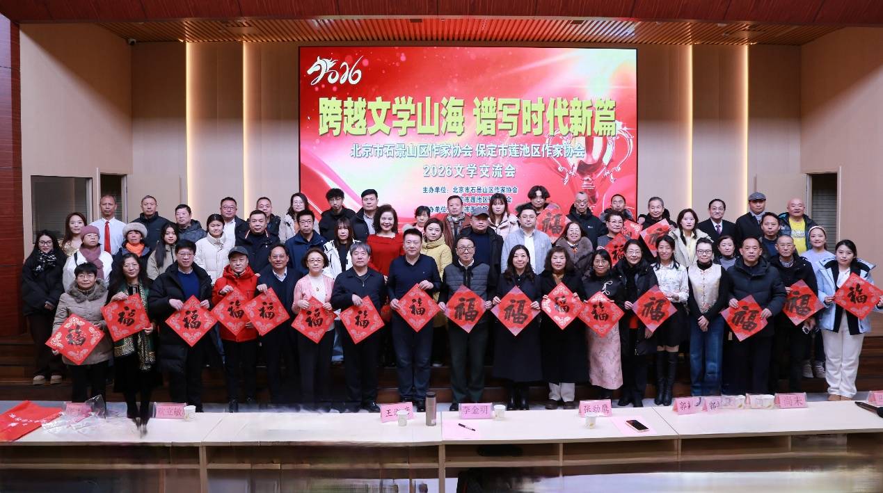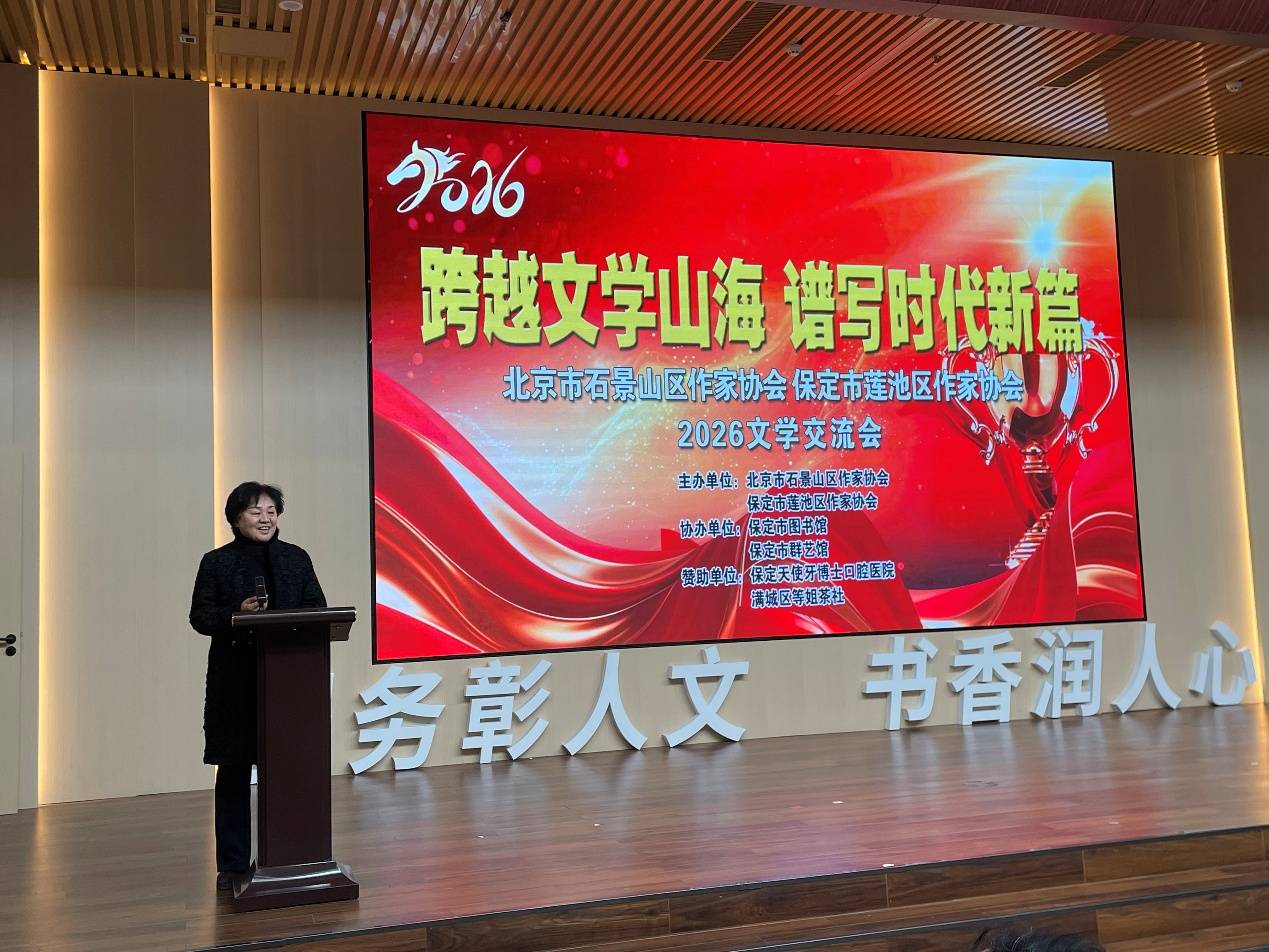 2026年1月24日,北京市石景山区作家协会12名会员应邀到保定市,与莲池区作家协会联合举办了“跨越文学山海 谱写时代新篇”2026文学交流会。北京市石景山区作家协会主席李金明,驻会副主席代志强,保定市文联二级调研员张劲鹰,保定市作家协会主席王淑彦,保定市作家协会常务副主席、莲池区作家协会主席尚未,莲池区文联主席郭艳华等出席了交流活动。两地作家、文学工作者等百余人齐聚在保定市图书馆共襄盛会。回顾了两地文学创作成果,就2026年培育健康创作生态、展望新时代大众文艺发展前景展开交流。