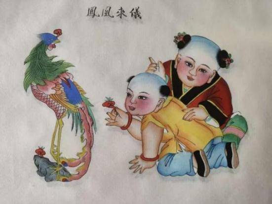 《凤凰来仪》此图描绘两个娃娃在戏逗禽鸟。凤凰是传说中的瑞鸟,则有吉祥如意之兆。