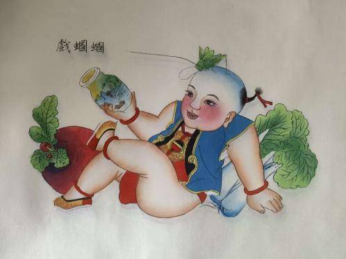 《戏蝈蝈》,“蝈蝈”谐音“哥哥”,故旧民俗中叫“蝈蝈”为育男孩之兆。