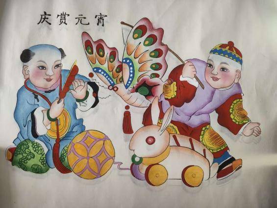 《莲灯太师》描绘两个娃娃在观灯戏狮狗,以“莲”“灯”“狮”谐音,古代官制,太师为三公之音,故莲灯太师即连登太师,为祝愿发迹升官之颂词。