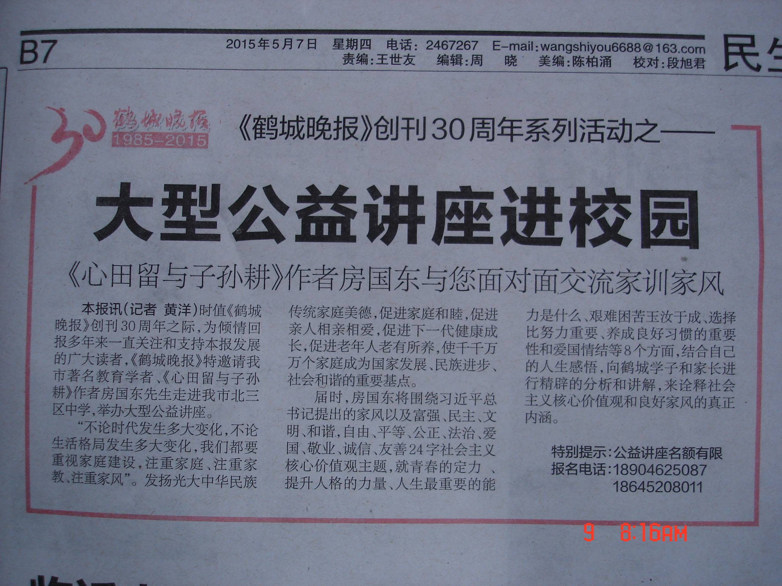 由于我出版了一部当代传世家训《心田留与子孙耕》,引起了一些社会团体和个人对我的关注。因此,使我有机会更多接触家长、更多听到家长们的呼声、更多感受到家长们的困惑。开始认识到,中国要有好孩子,当务之急是提升家长。2017末,齐齐哈尔市外国语学校董事长孙洪光同志,因为看到我的书(《心田留与子孙耕》),跟我探讨家庭教育方面的问题,于是,力邀我到外国语学校做家校合作管理委员会主任,兼做“家长学校”校长。“周五家长课堂”在我手举办46期。当我得以系统持续地在一个相对稳定的“家长课堂”传播家庭教育理念的时候,相较于那种随机性、游走式“家庭教育”传播方式,我感受到了“家长课堂”应该是家庭教育不可或缺的选项。