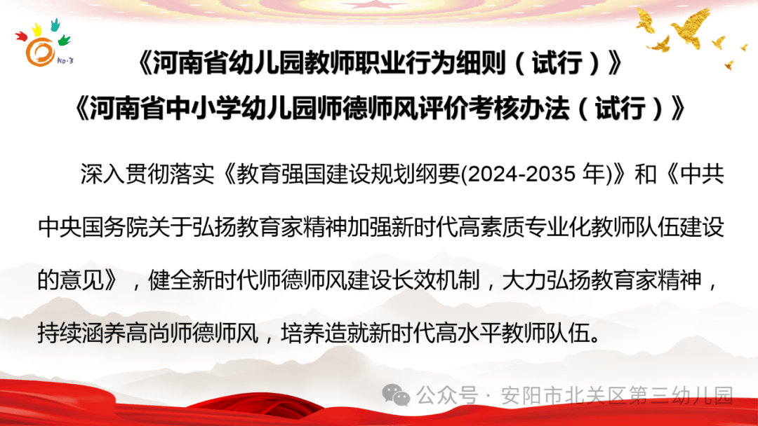 北关区第三幼儿园将持续以《教育强国建设规划纲要》为指引,筑牢师德根基,将师德规范融入日常保教工作的各个环节,以专业与爱心点亮童年,为幼儿的健康成长保驾护航!