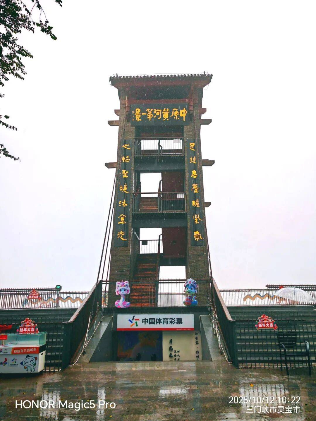 这里是滔滔黄河自西向东经潼关入豫的第一站。母亲河以巨龙般的身姿在此划出一道C形大弯,造就了独特的“九曲黄河”景观。据说天气晴好时,静水区域泥沙沉淀,河水呈青绿色,与上游的青黄色形成鲜明对比,可观赏到“半是浑黄半碧玉”与“落日熔金”的奇景。河岸一处海拔500多米的台塬上,矗立着一座20多米高的明清风格观景台,四周立着半人多高的不锈钢护栏。虽雨雾蒙蒙,但其顶部“中原黄河第一景”七个金色隶书大字,依旧格外夺目。这里本是百里横岭观赏黄河的绝佳之地,平日游人如织,此刻环顾台塬,却唯有我们一行,不见其他半个人影。