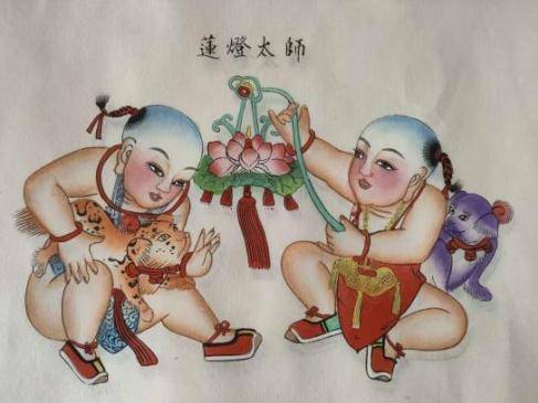 《莲灯太师》描绘两个娃娃在观灯戏狮狗,以“莲”“灯”“狮”谐音,古代官制,太师为三公之音,故莲灯太师即连登太师,为祝愿发迹升官之颂词。