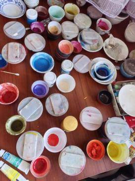 今年的春天,我们相约会谈,走近了她。她衣着朴素,善良憨厚的笑容,利落的短发像一缕缕青丝自然发亮。她的眼神一丝不苟的凝视着那套大气的年画册页,向我介绍版画里面的内容及制作工艺,这本册页含有12张经典年画。这是她为客户代加工的作品,目前订单很多,这份订单她刚开始着手绘描,下一份加工作品又给她送来。一间十几平米的画室窗明几净,地面洁白。白色案台和方桌上摆满了七彩缤纷的年画颜料,不下几十种,她告诉我先从哪下笔描绘,最后从哪里收笔。画册主体颜色是以红黄蓝为调色的。里面的人物姿态万千,充满了灵动性。我对这本册页很感兴趣,仔细观察每一幅画的人物造型。描颜色是要把原版图片横放的,而不是正面描色,侧描有利于最后对人物眼睛的线条收笔。在这里,闻到了水墨丹青的韵味,看到的是非遗文化的光芒在闪烁。